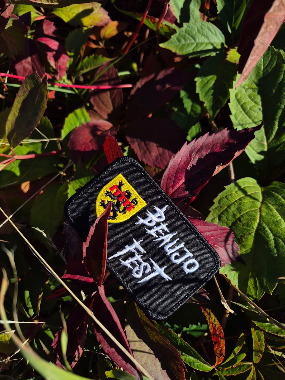 Design emblématique : logo écusson et broderie "Beaujo'Fest" en fil blanc sur fond noir.