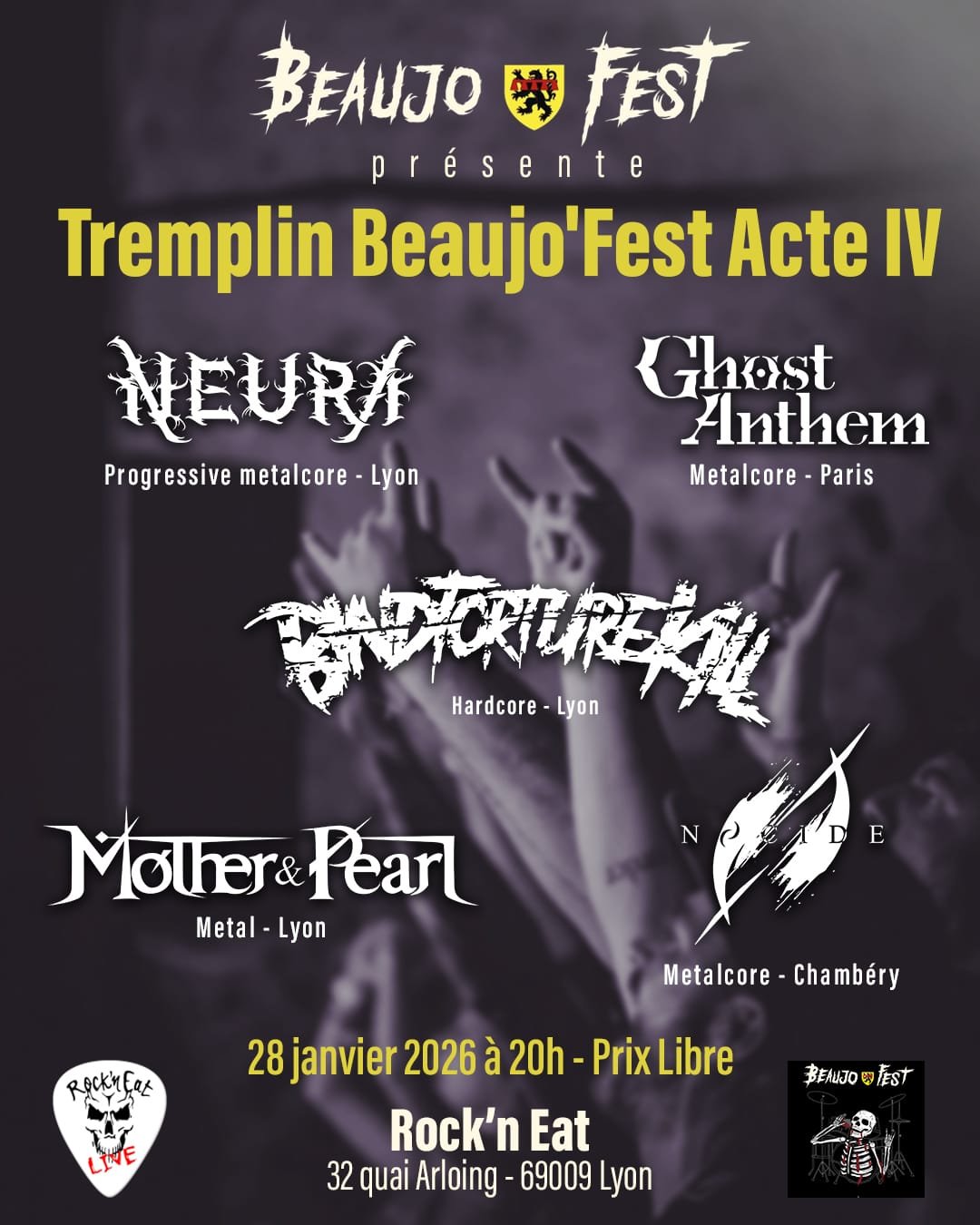 Le 28 janvier 2026, rendez-vous au Rock’n’Eat (Lyon) pour une soirée placée sous le signe du métal et du hardcore 🤘 À partir de 20h, venez découvrir les 5 groupes sélectionnés pour le Tremplin Beaujo’Fest !